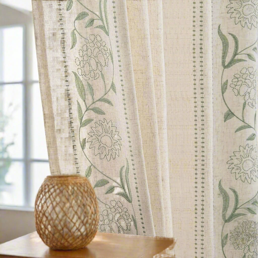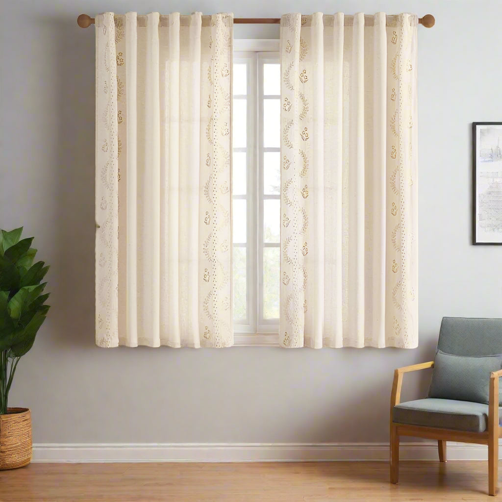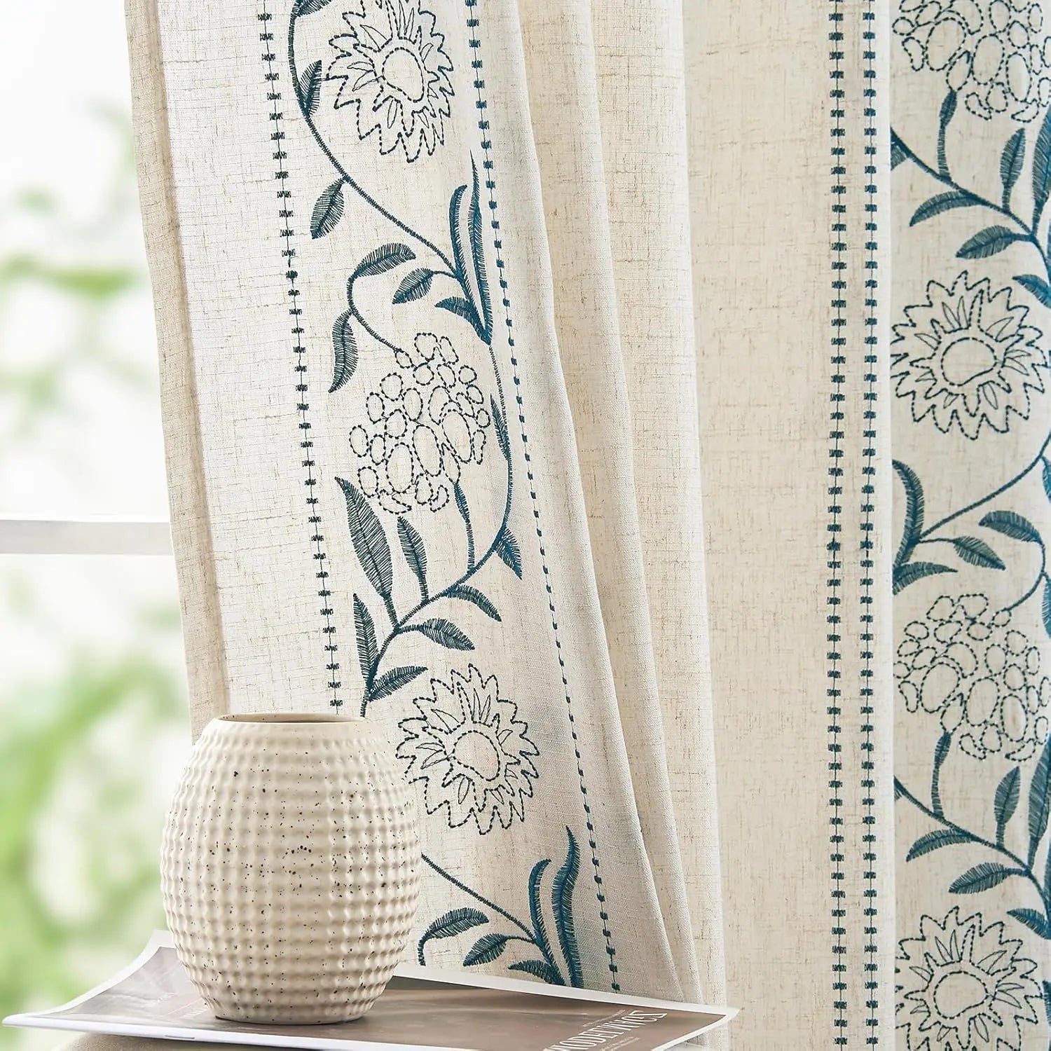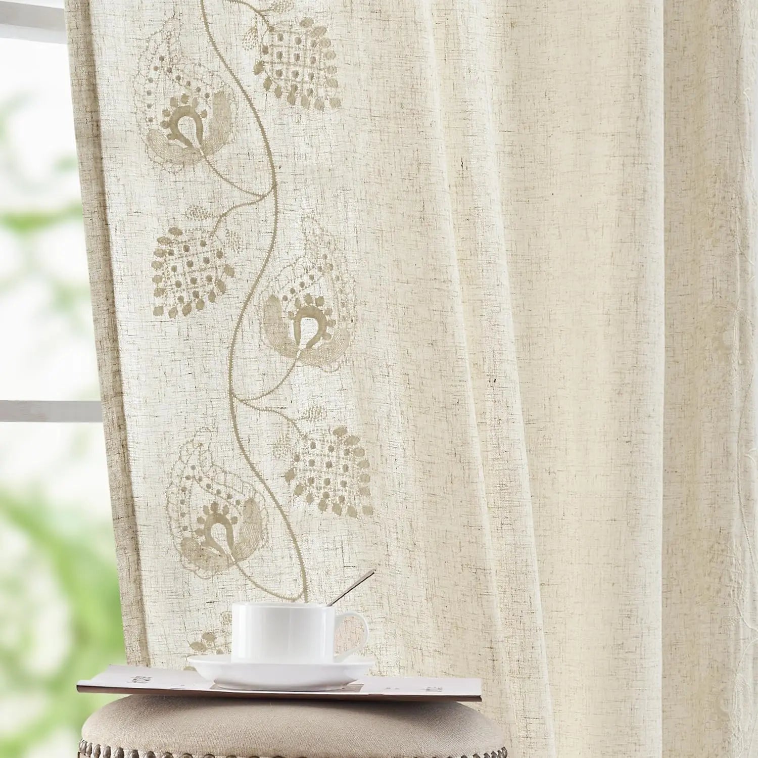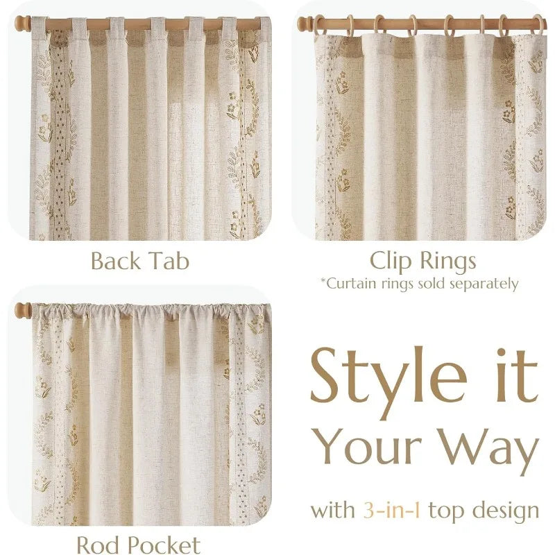 Elevate your bedroom with these beautifully embroidered linen blend curtains in a soft beige hue. Each set includes two panels, 50 inches wide and 63 inches long, combining to 100 inches of elegant coverage. The delicate floral embroidery adds a romantic, natural charm ideal for farmhouse or country-inspired interiors. Made from durable, soft fabric, these curtains filter light gently while maintaining privacy. Featuring both rod pockets and back tabs, they fit rods up to 1 1/2 inches in diameter and can be paired with blinds or sheers for enhanced style and functionality. Create a warm, inviting atmosphere with these timeless curtains.