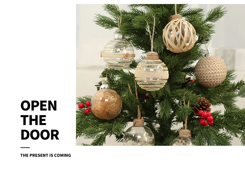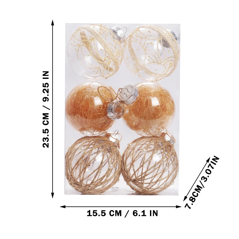 Bring natural elegance to your holiday décor with this stunning set of six clear ball ornaments. Each sphere features a charming jute and straw binding that adds rustic warmth and texture to any tree. The transparent design lets you fill them with your favorite seasonal fillers—greenery, berries, or metallic accents—for a personalized touch. Perfect for creating a cohesive, nature-inspired look that complements both traditional and modern interiors. These versatile ornaments work beautifully as standalone pieces or mixed with your existing collection for added visual interest and dimension.