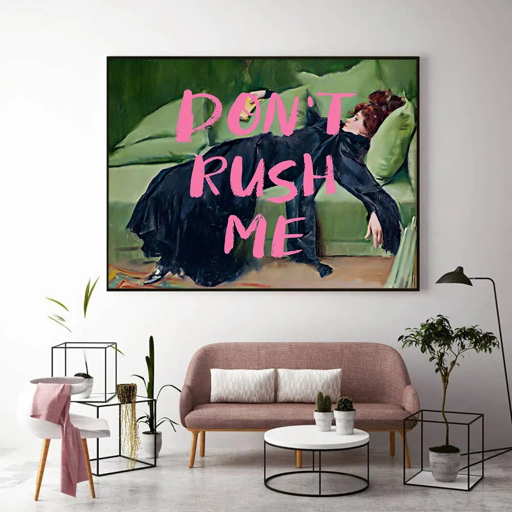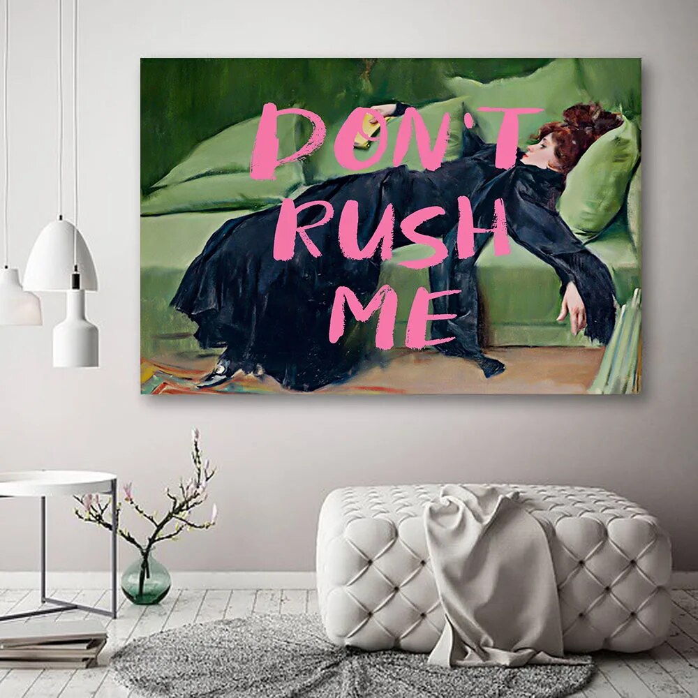 This canvas painting is a unique artwork that will add a little quirk and humor to your walls. Its abstract pink graffiti features a classic saying with a modern twist: "Don't rush me". Crafted with cotton and illustrated in a feminine portrait, it's an eye-catching piece of art sure to make you smile!