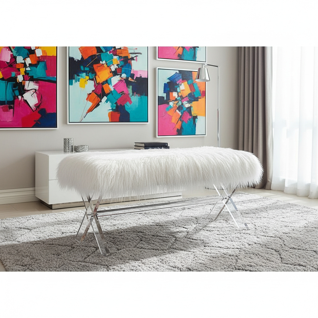 White Faux Long Hair Fur Bench with Acrylic Legs
