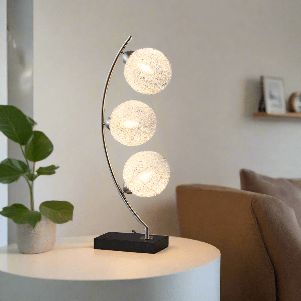 Designed to create an impact on any console or side table, this modern table lamp boasts a fresh, elegant look with a vertical chrome frame and three orb shades made from metal mesh. The graceful silhouette and trio of shades provide a striking effect of light and shadow, while the three energy-efficient 4-watt bulbs deliver bright illumination at a fraction of the cost. The lamp rests on a rectangular base with a black finish and can be easily operated with a touch switch. Elevate your space with this exquisite piece and add a touch of modern elegance to your decor.
