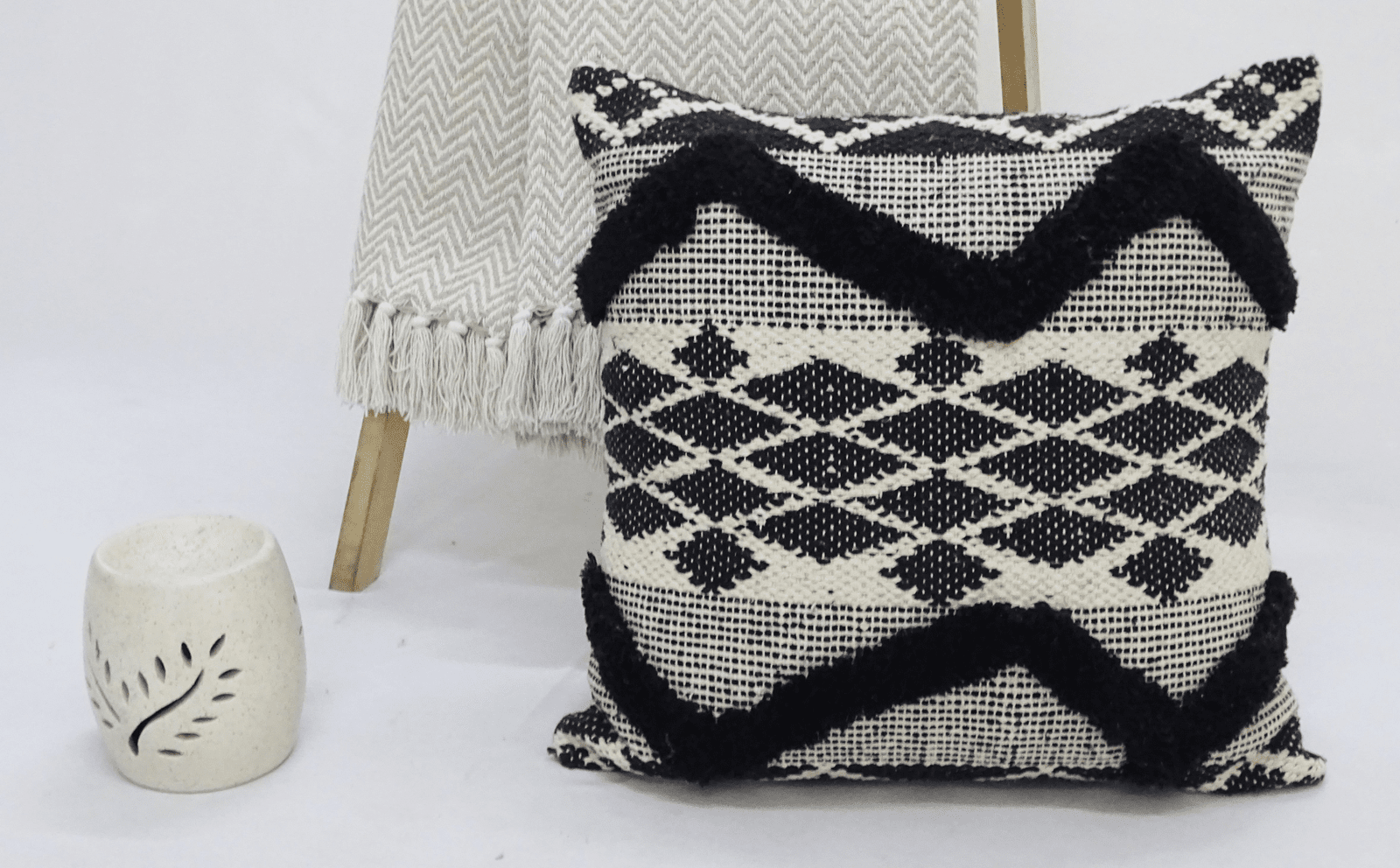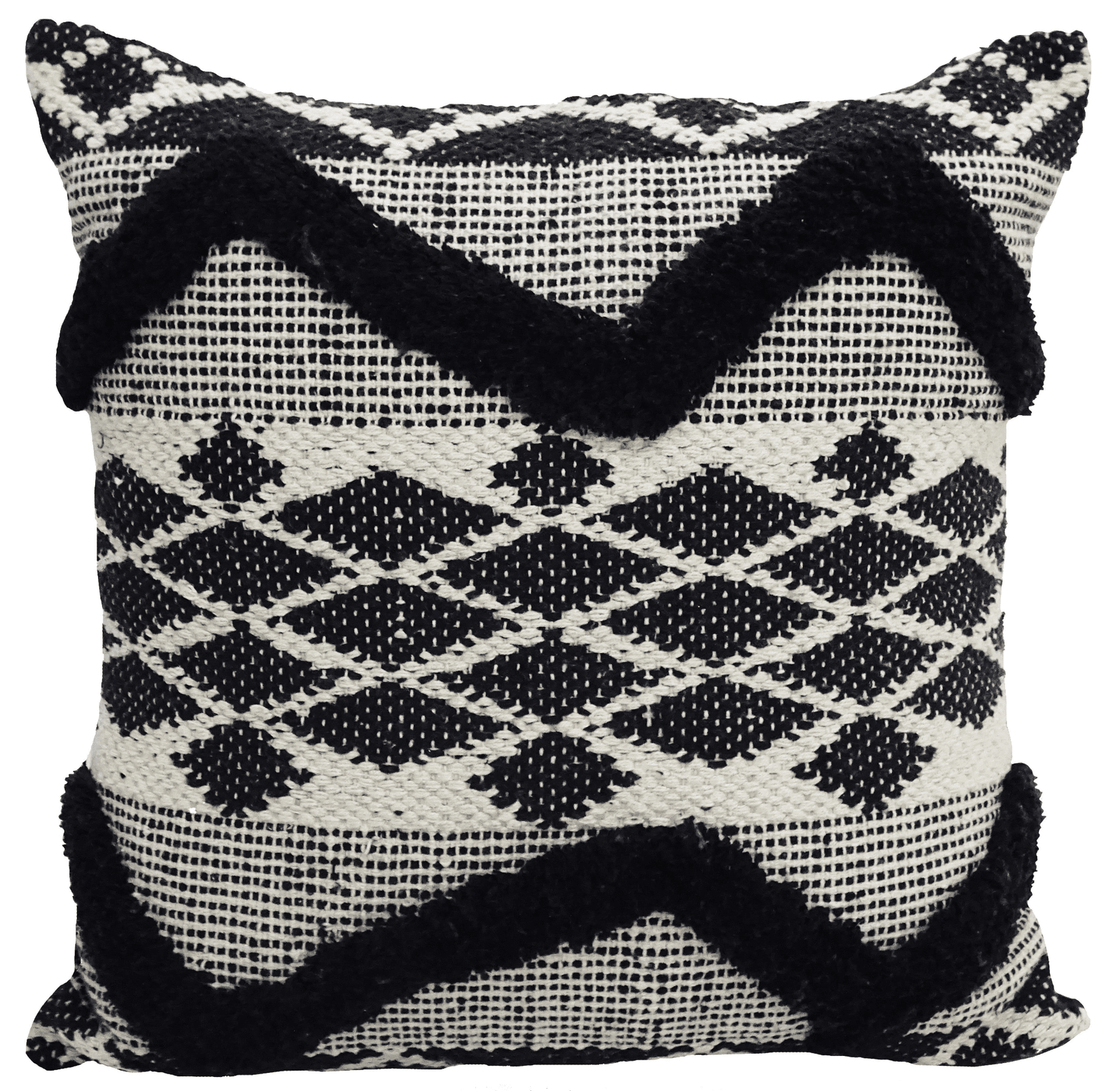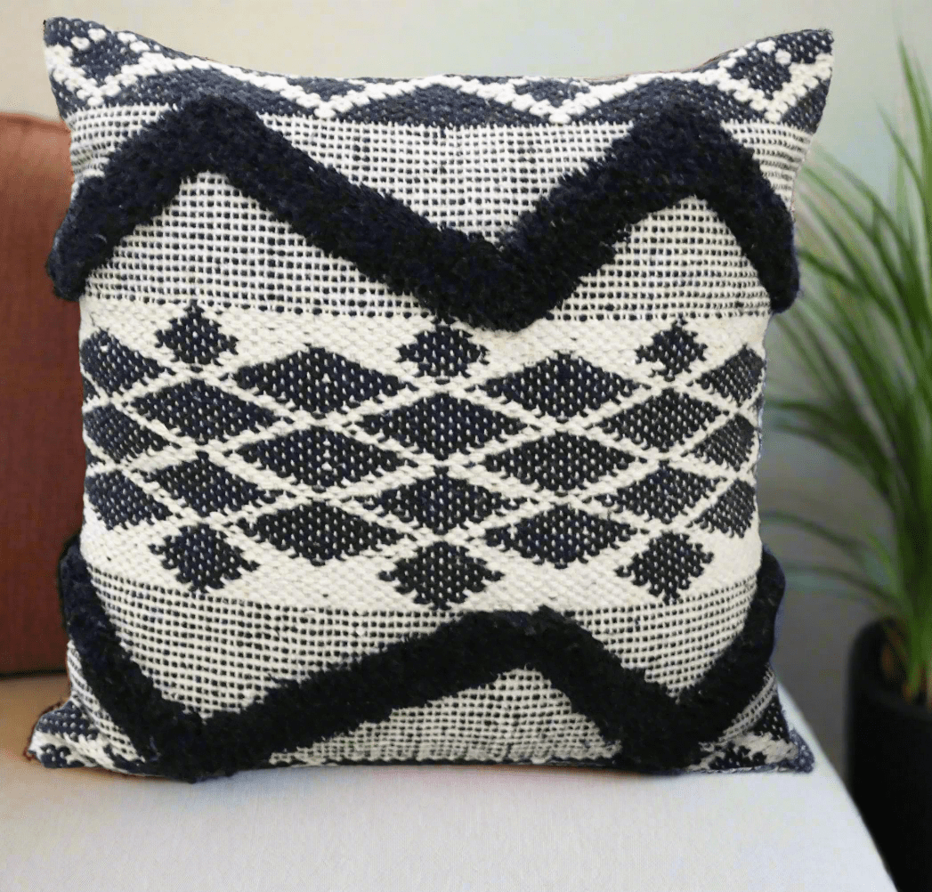 Transform your home with our Black Tufted Chevron Boho Full Throw Pillow. This stunning accent piece creates a welcoming atmosphere that works beautifully year-round. Featuring exquisite handwoven geometric patterns with distinctive tufted chevron details, this 20x20 pillow blends seamlessly with modern and classic interiors alike. Crafted from premium 95% cotton and 5% polyester, each pillow arrives complete with a high-quality insert. The artisanal cover, made in India and finished in the USA, adds that perfect designer touch to elevate your entire living space.