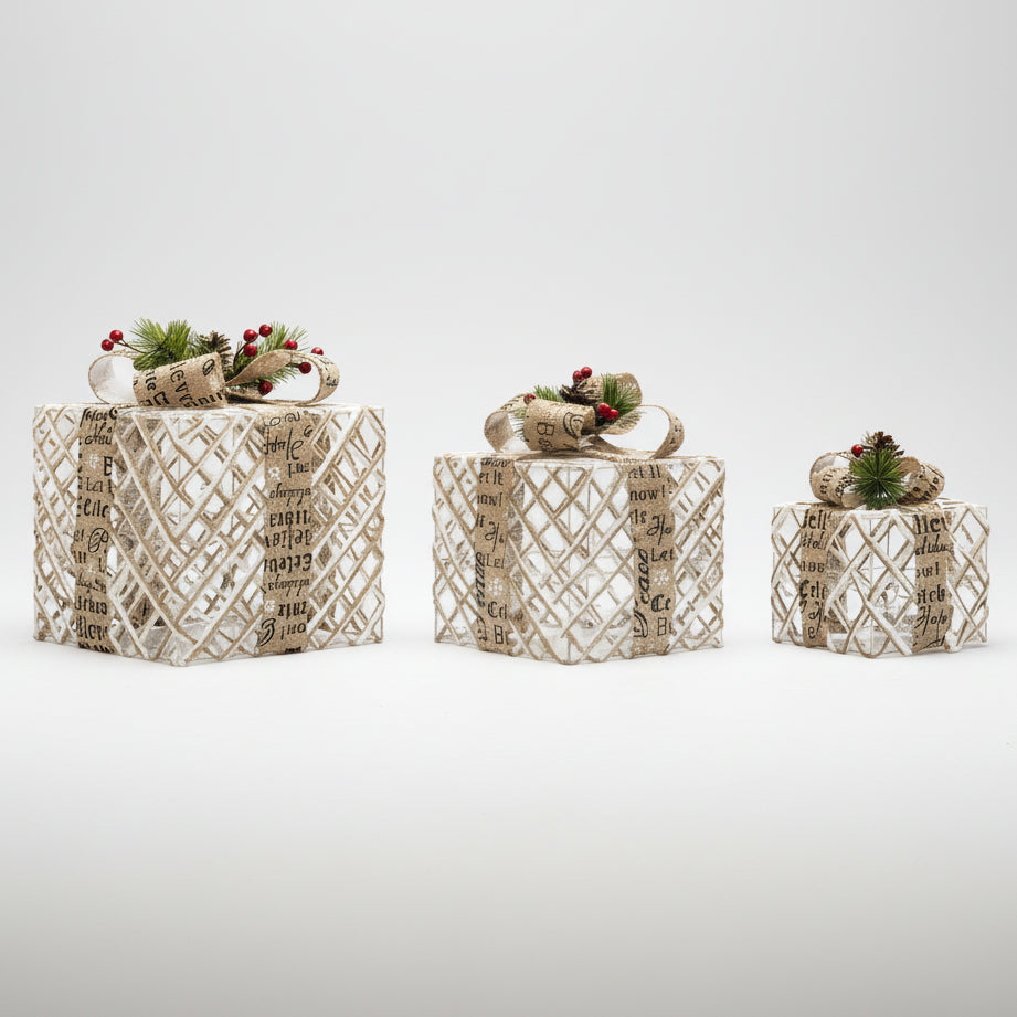 Flocked & Lit Set of 3 Christmas Present Decorative Boxes