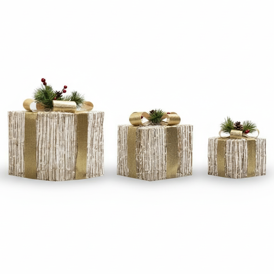 Illuminate your holiday season with this enchanting Christmas Glow Gift Box set. This three-piece collection features beautifully crafted iron boxes adorned with festive flocking details, each enhanced with 30 LED lights that create a warm, magical glow. Perfect for decorating your Christmas tree, mantelpiece, or any space in your home, these ornaments bring festive charm and ambient lighting to your celebrations. Transform your holiday décor with these stunning light-up decorations that combine traditional beauty with modern illumination for an unforgettable festive atmosphere.