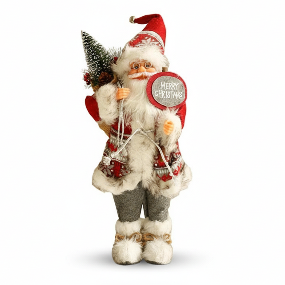 Transform your home into a holiday haven with this impressive 60cm Santa Claus decoration. Expertly crafted from quality fabric with beautifully detailed knitted attire, this charming figure radiates authentic Christmas spirit. Whether positioned in a window, displayed on a shelf, or placed near your entrance, it instantly elevates your seasonal décor with timeless appeal. The lifelike details and cheerful demeanor make it a conversation-starting centerpiece that captures the magic of the holidays. Perfect for creating festive memories and welcoming guests with warmth during the New Year season. Measuring 60cm including the hat, it's a statement piece that brings undeniable holiday charm to any room.