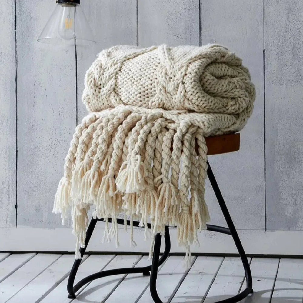 Wrap yourself in luxury with this Beige Soft Chunky Knit Tasseled Throw Blanket. Handcrafted from premium materials with a cashmere-like texture, it's perfect for draping over your sofa or bed. Measuring 120x150cm and weighing over 2kg, this versatile blanket combines warmth with style. Decorative tassels and a timeless beige hue make it an elegant addition to any room, while the breathable, durable fabric ensures lasting comfort for years to come.
