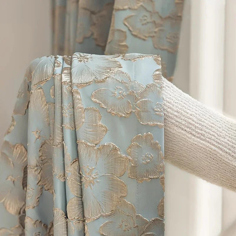 Blue Gold Embossed Flower Jacquard Grommet Curtains