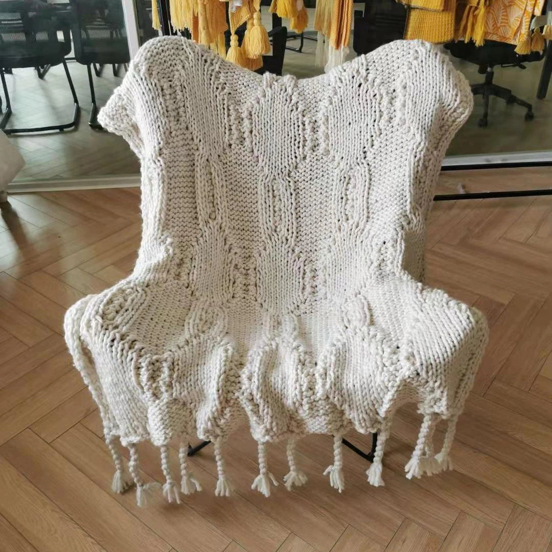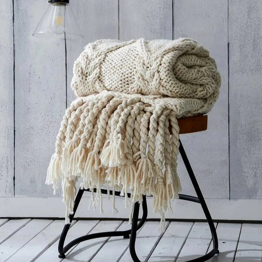 Chunky Knit Blanket Beige Soft Tassel Plaid Throw Blanket