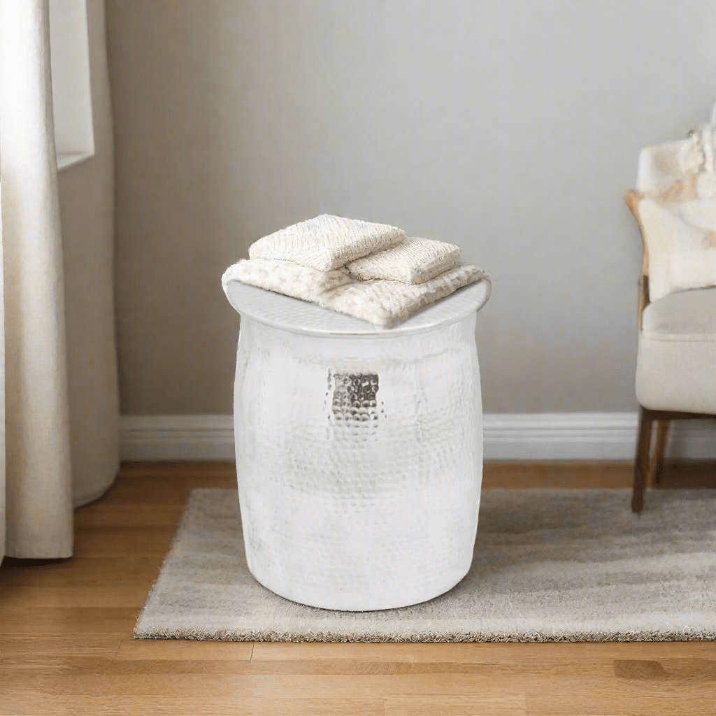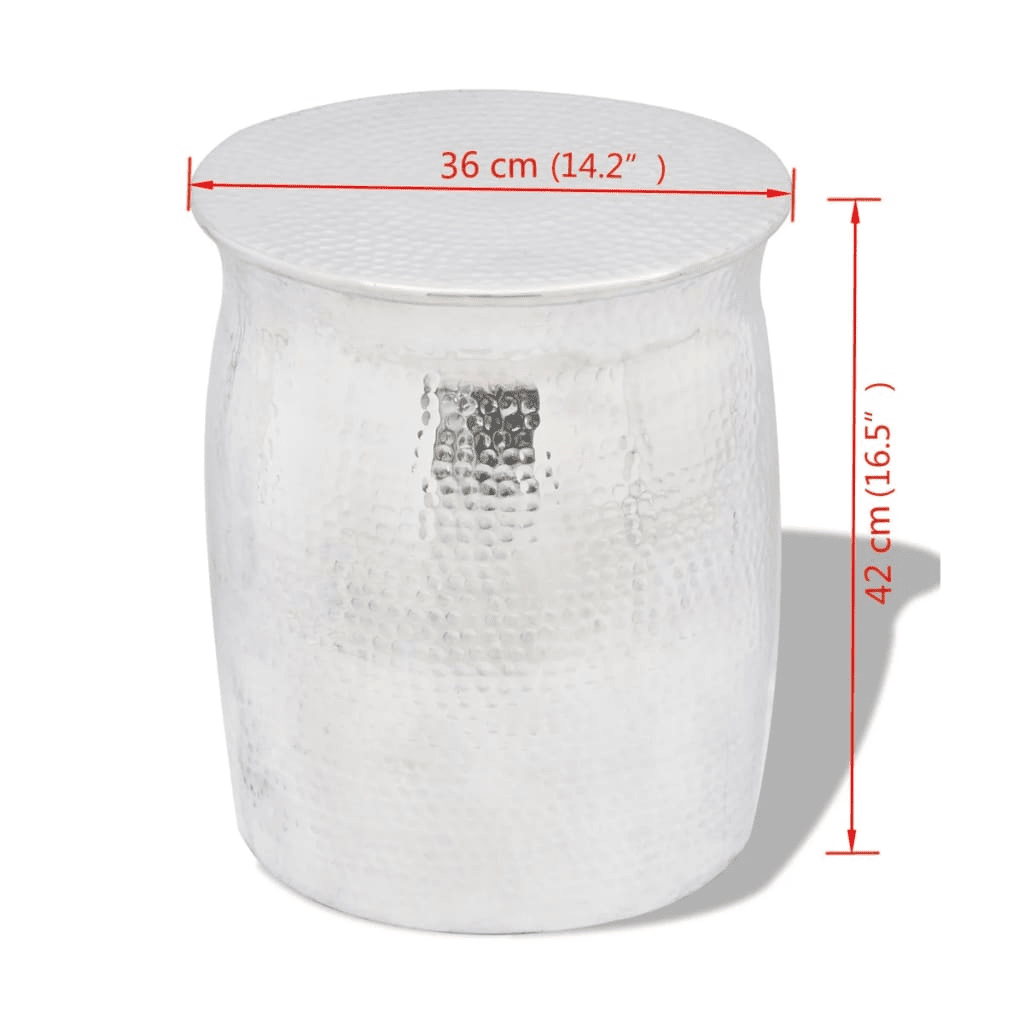 This Hammered Aluminum Side Table is a standout piece for any living space. It adds both function and style. With its sleek cylindrical shape and intricate hammered surface, it's not just a side table but also a cute stool that goes well with different interior styles, making it a great choice for serving coffee or showing off plants.