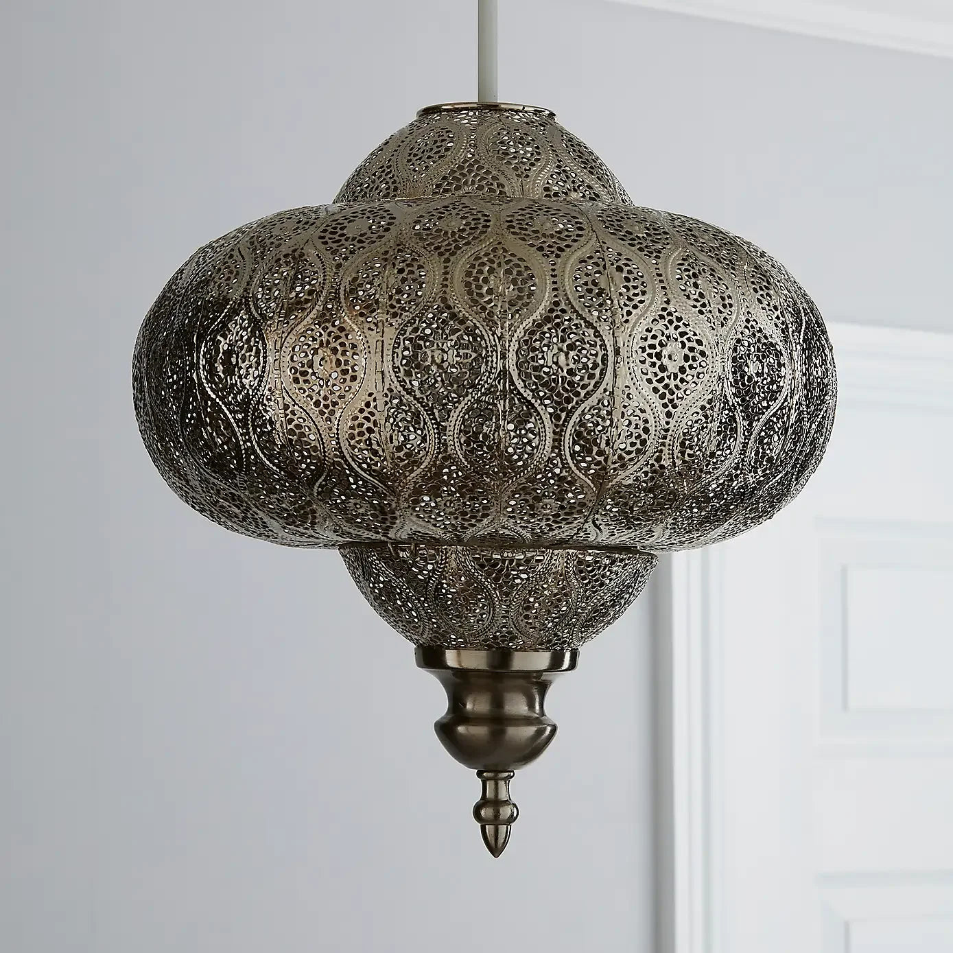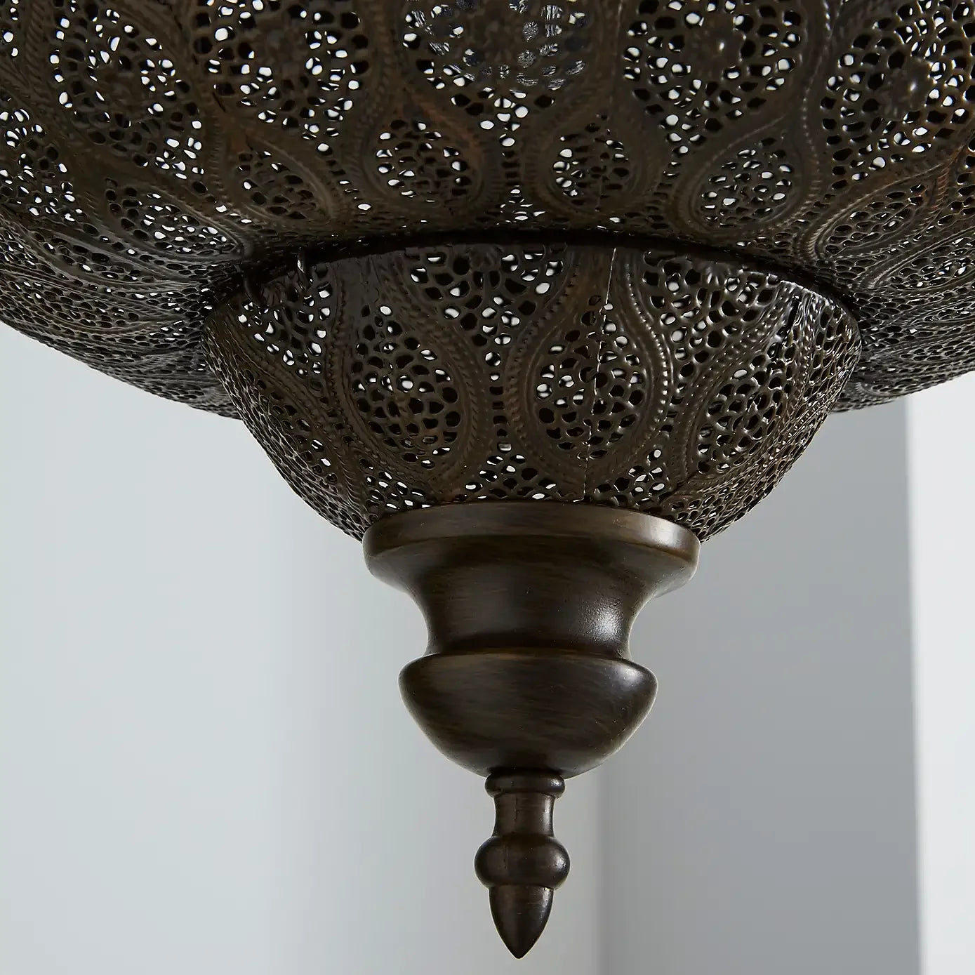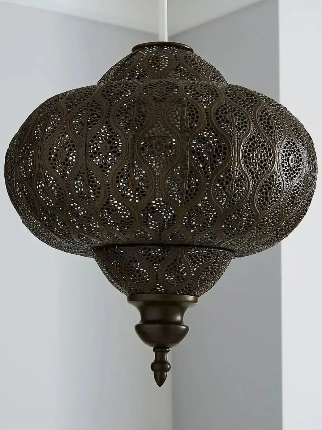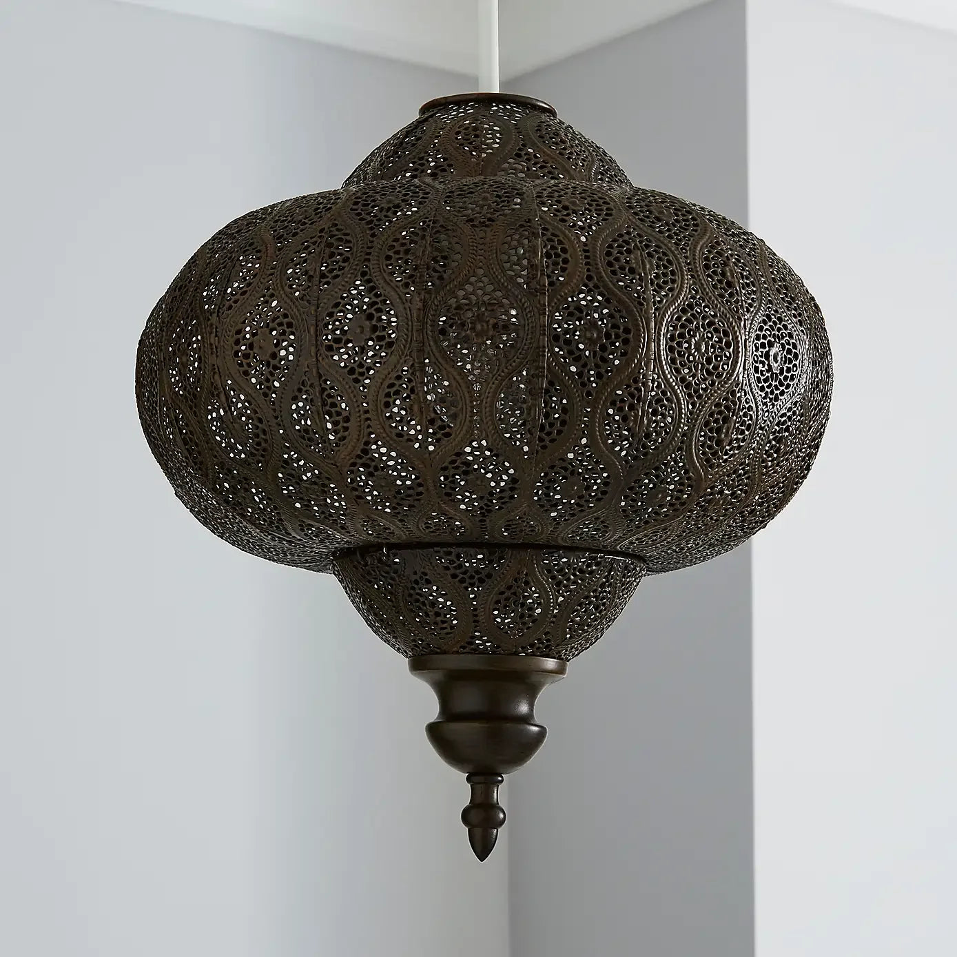 This Moroccan pendant features an intricate cut out detail with a filigree patterned effect, adding a touch of beauty and charm to any room. It's easy to fit and comes in a variety of metallic finishes. With part assembly required, you'll have it installed in just minutes and ready to light up your space! Make sure to choose the right bulb for your existing ceiling fitting. Ideal for a quick and effortless style change without needing to hire an electrician. Product dimensions are H 29cm x Dia 29cm and it is suitable for use with ceiling lights. Available as a shade or full pendant lamp.