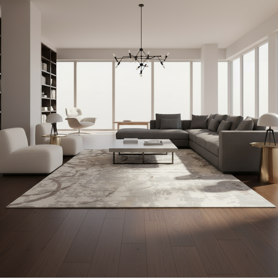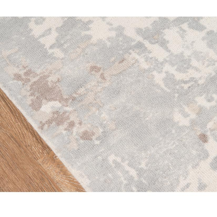 This large wool rug features a modern design inspired by raw concrete textures. Its abstract pattern mixes grey, beige, and blue tones for a stylish, contemporary look. Made from 100% natural wool, it adds comfort and a trendy touch to any room.