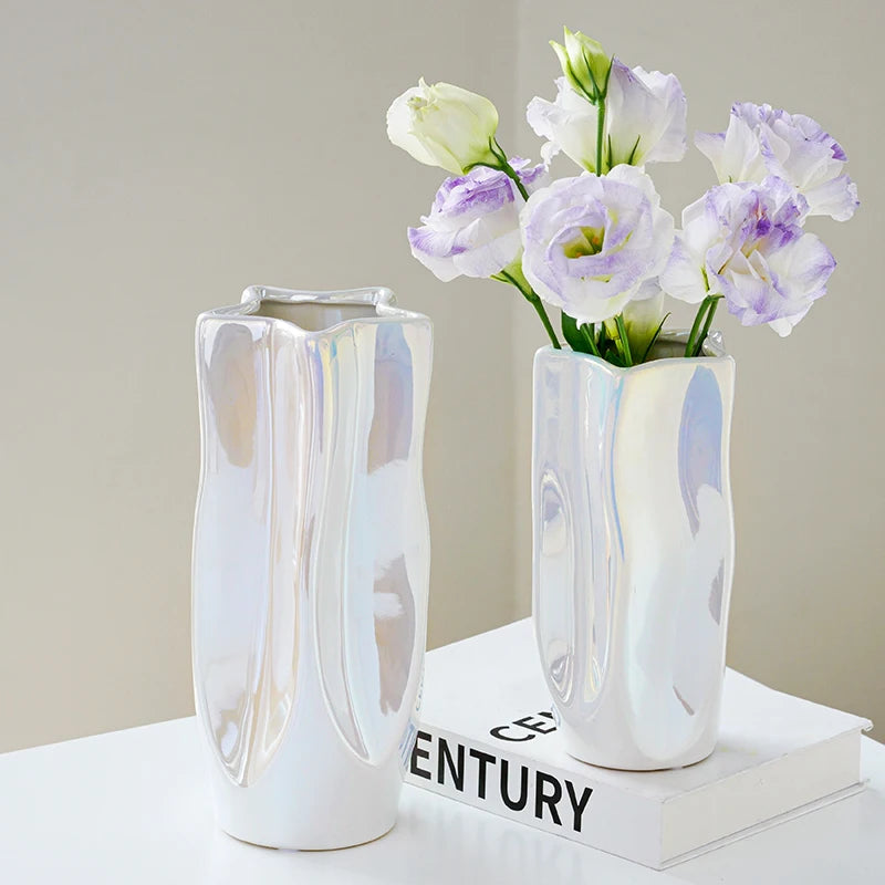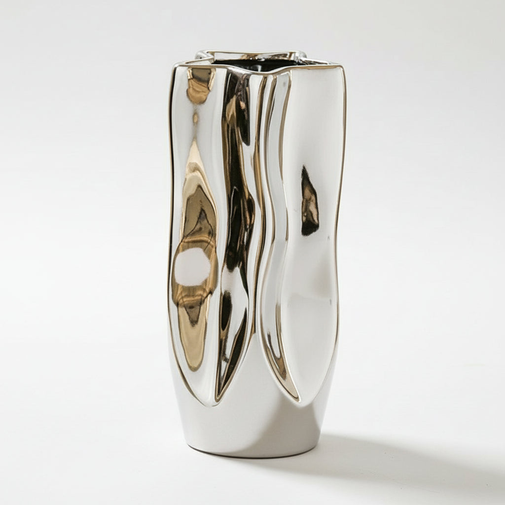 Elevate your space with this stunning electroplated silver ceramic vase, where sophisticated craftsmanship meets modern elegance. The irregular porcelain design creates visual intrigue, making it a captivating focal point for any room. Perfect for fresh flower arrangements or hydroponic displays, this versatile piece seamlessly transitions from traditional to contemporary décor. The luxurious silver finish catches light beautifully, adding dimension and refinement to shelves, tables, or entryways. Whether you're a design enthusiast or seeking that perfect finishing touch, this ornamental vase transforms ordinary spaces into curated sanctuaries of style and grace.