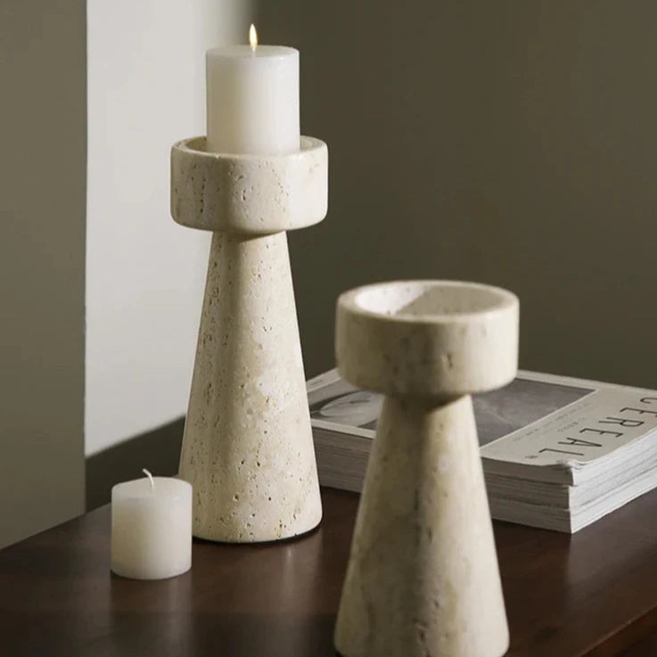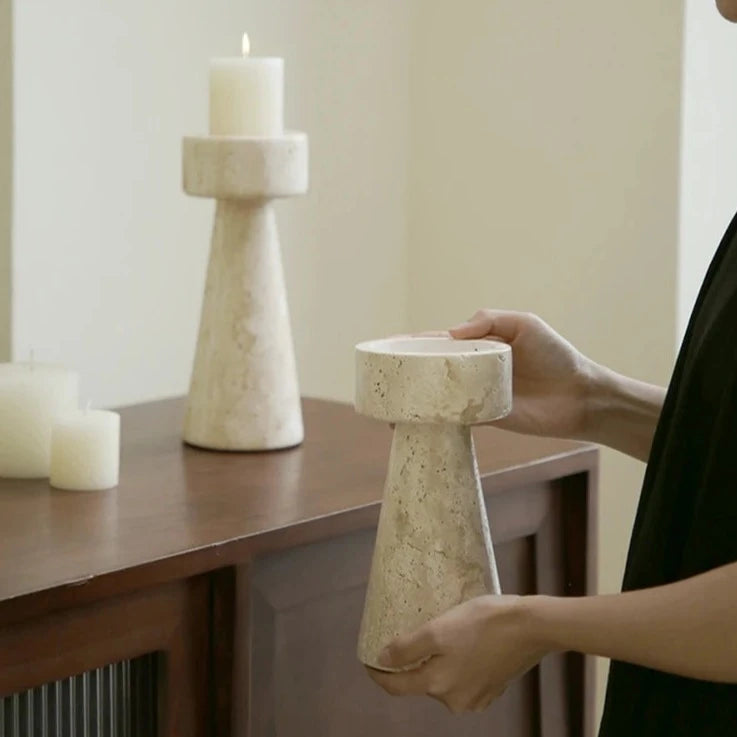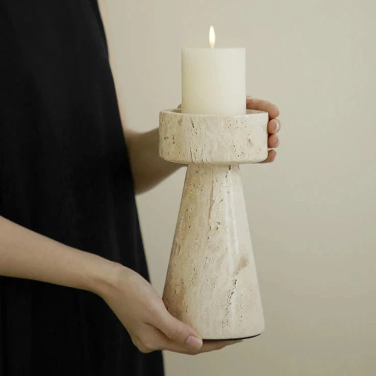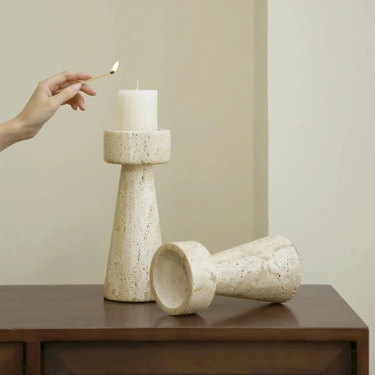 Introducing our must-have Minimalist Travertine Stone Candlestick Holder, the perfect addition to elevate your home decor. Made from luxurious travertine stone, this stylish candle holder adds a touch of Nordic style to any space. Crafted with high-quality materials, it is versatile and suitable for weddings, parties, and dining events. Embrace the warm and inviting atmosphere created by this essential piece, perfect for every home. Handmade with care, this candlestick holder comes in two sizes - small (8.5x18cm) and large (8.5x22cm). Available in a beautiful beige color, it pairs perfectly with column or ball candles. Shop now and add a touch of elegance to your home decor.
