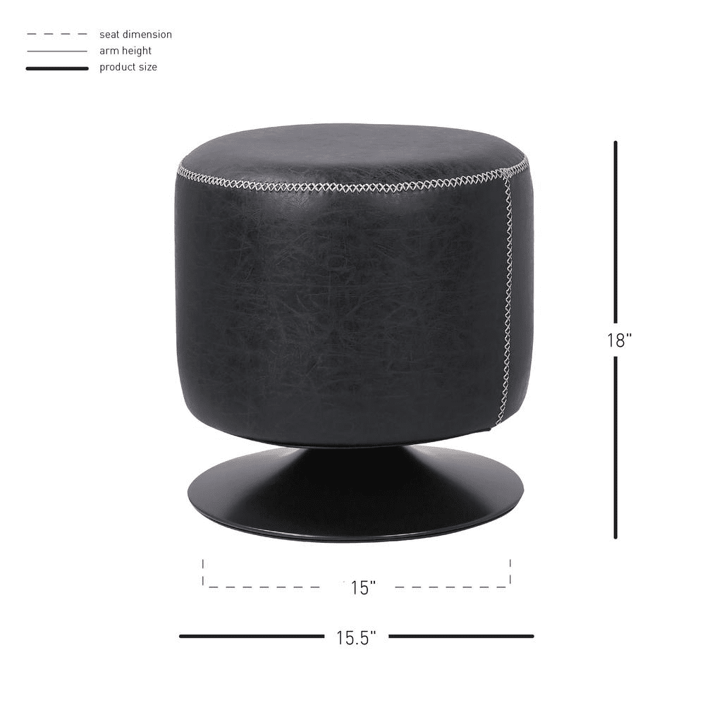 Experience the versatility of our Modern Industrial-style ottoman—more than just a place to rest your feet. This compact, multipurpose piece offers extra seating when needed or serves as a stylish platform for decorative trays. Featuring a Metallic Gray circular steel base with a smooth 360-degree swivel, it’s upholstered in vintage black PU leather adorned with distinctive X-stitch detailing. Crafted for durability and easy maintenance, this fully assembled ottoman measures 16" in all dimensions and supports up to 250 lbs. Also available in Vintage Coffee Brown, it’s a perfect blend of style and function backed by a one-year warranty.