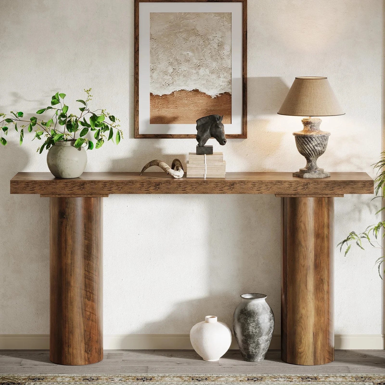 Inspired by genuine farmhouse design, this entryway table features a natural wood grain finish and classic pillar legs, creating a cozy and inviting feel that complements any décor. Built with durable dual pillar legs crafted from premium MDF, it delivers both stability and rustic charm. The 1.97-inch thick tabletop offers a stable surface and ample space (62.99" W x 11.81" D) to display candles, vases, or other accents without crowding your space. Its versatile farmhouse style makes it perfect as a console table in the entryway, sofa table behind a couch, or a decorative piece in any room.