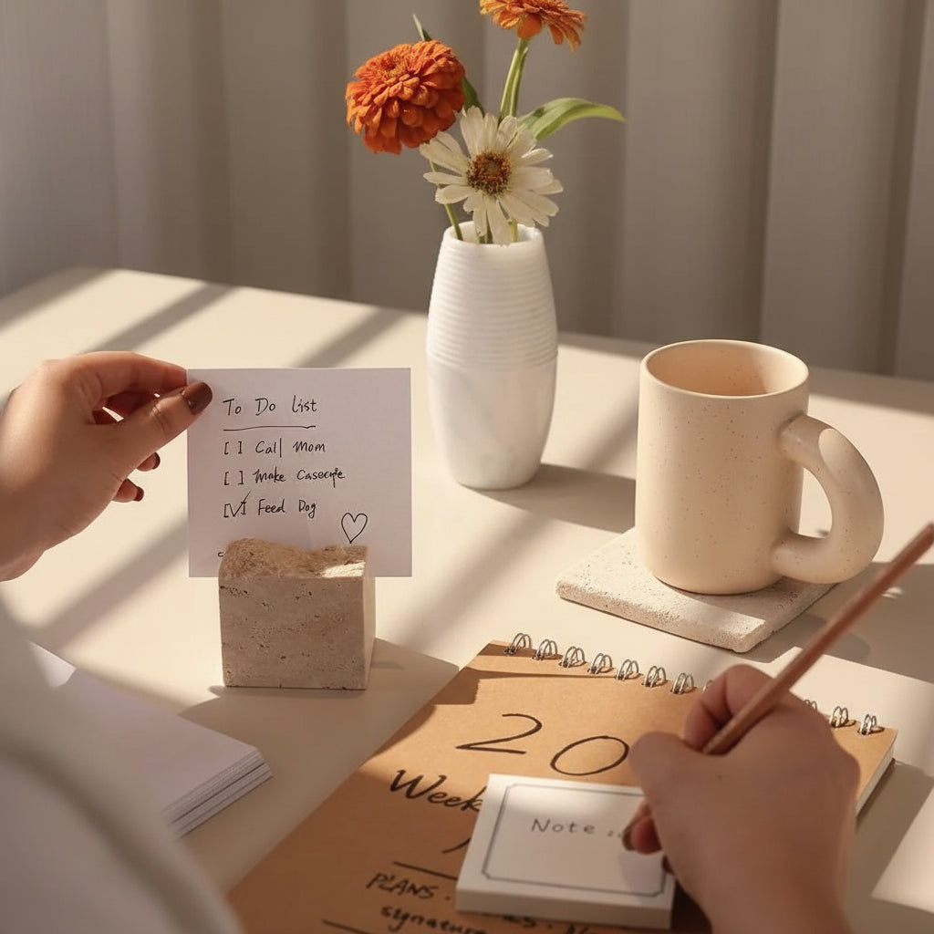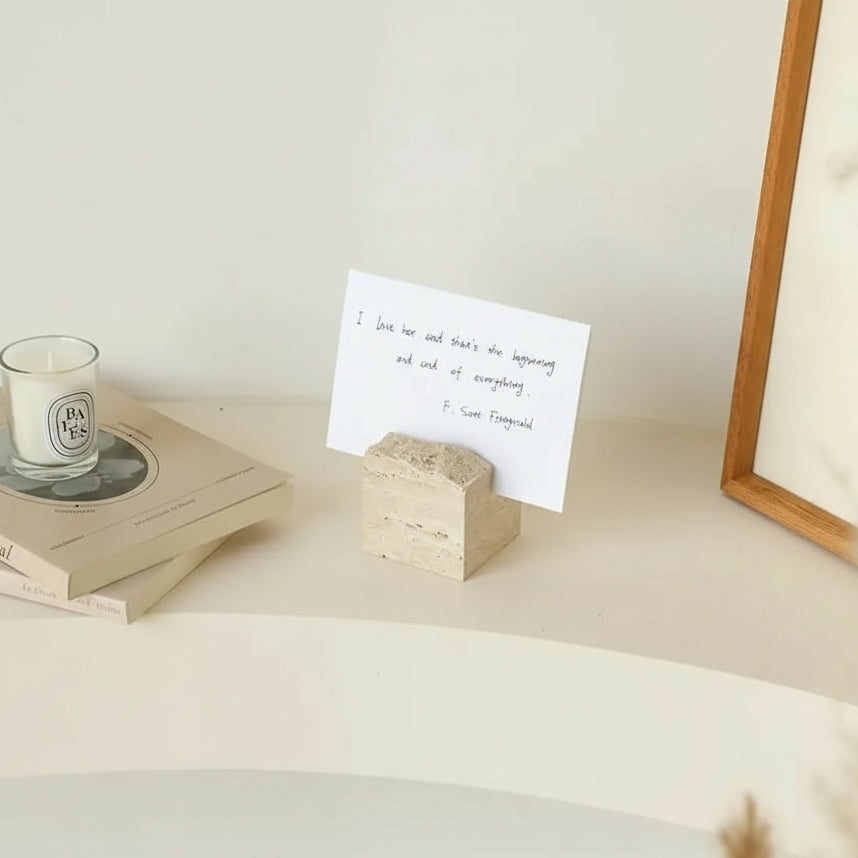 Crafted from authentic travertine marble, this elegant desk accessory brings natural sophistication to any workspace. Each piece showcases distinctive veining and texture—no two are alike—creating a truly one-of-a-kind display. The hand-finished surface delivers a refined, minimalist aesthetic that complements modern and traditional décor alike. Versatile and practical, it accommodates business cards, photos, table numbers, menu cards, and event signage with ease. Built to endure, this durable marble holder maintains its polished finish for years with minimal care. At a compact 5cm cube with a 0.3" wide groove, it's perfectly sized for desktop placement or event styling. Transform your space with timeless natural beauty that speaks to quality and taste.