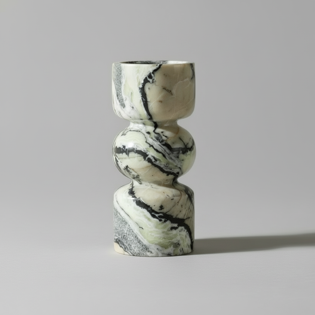 Crafted from solid natural marble, this stunning candle holder transforms any space into a gallery of refined elegance. Each hand-carved piece reveals its own distinctive character through captivating veins of ivory, moss green, and charcoal — nature's signature artistry captured in stone. The bold, sculptural silhouette commands attention on mantels, coffee tables, and centerpieces, while the organic texture invites tactile appreciation. More than functional decor, it's a conversation-starting statement piece that elevates your home's aesthetic with timeless luxury and undeniable sophistication.