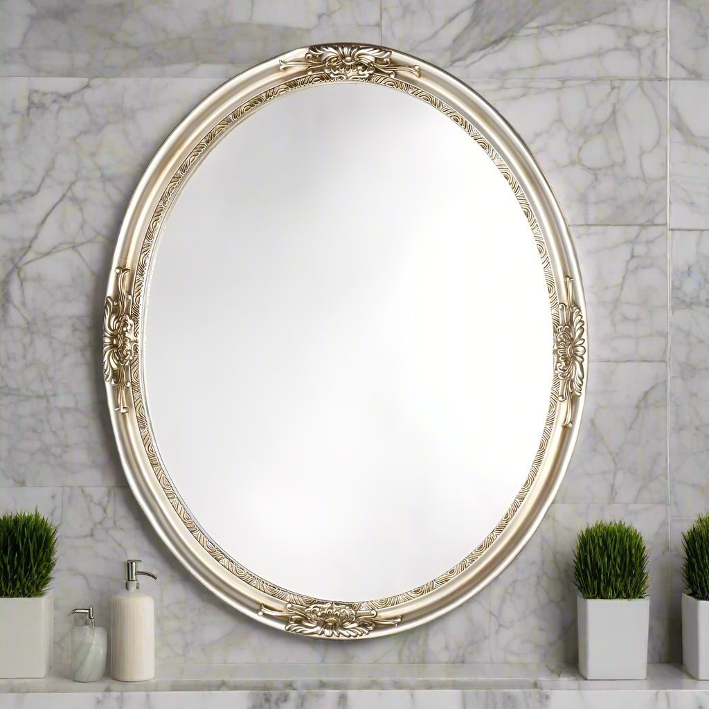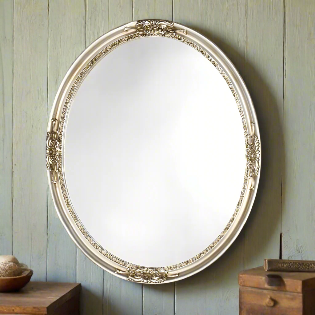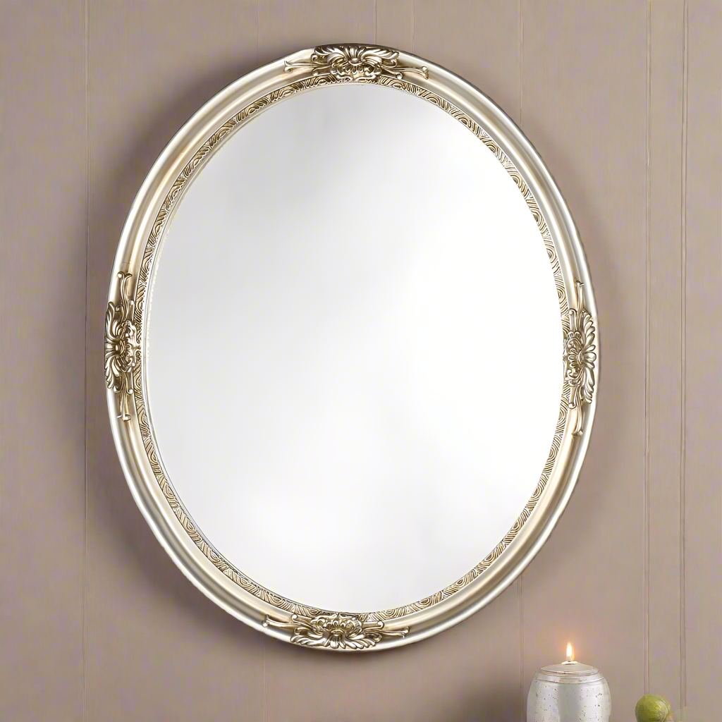 This oval shaped mirror features an antique silver finish that will complement many decors throughout your home. This piece can be used on a wall or as part of a table centerpiece, creating a stylish atmosphere wherever it is on display.