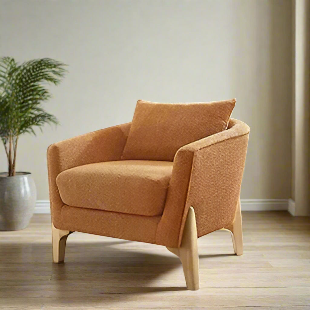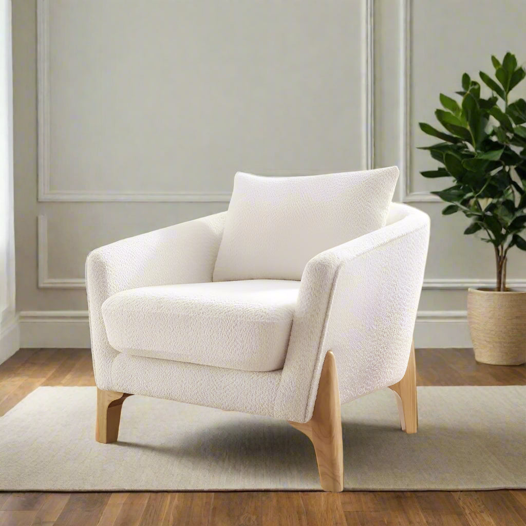 Featuring soft boucle fabric, this living room chair adds a touch of warmth and sophistication to your modern decor. Its ergonomic surround-back and generously sized seat cushion provide exceptional comfort, perfect for reading or relaxing. Supported by sturdy solid wood legs, the armchair offers stability with a weight capacity of 350 lbs, while its spacious 23"x20" seat allows for flexible seating positions. Ideal for living rooms, bedrooms, or home offices, this versatile accent chair combines style and comfort to elevate any space.