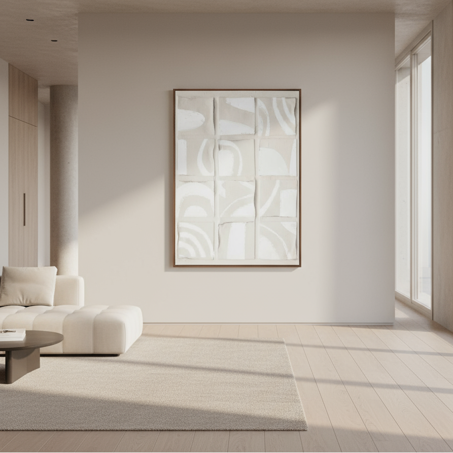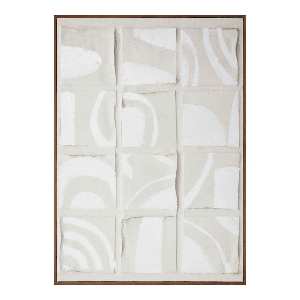 This abstract wall art showcases ink strokes arranged in a unique collage with calm neutral colors. Mounted on a sturdy pine frame, it’s ready to enhance your space with modern style and depth.