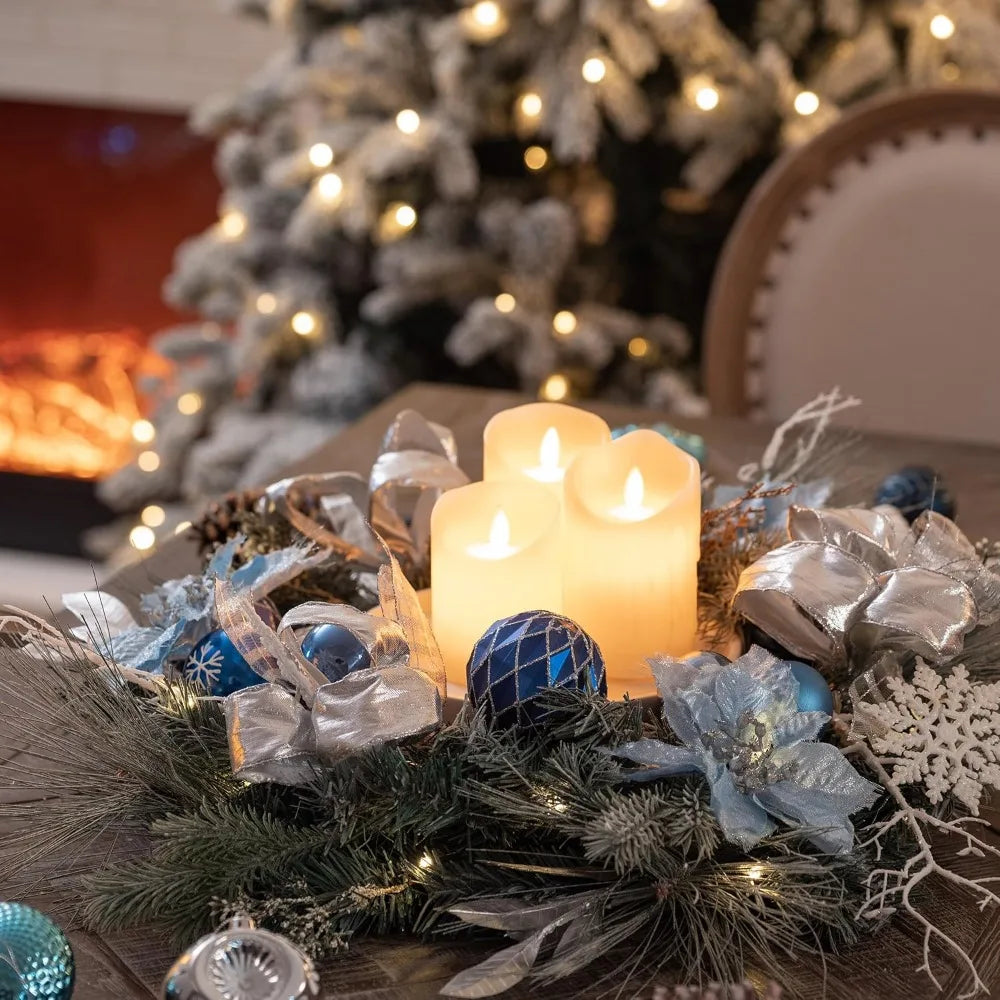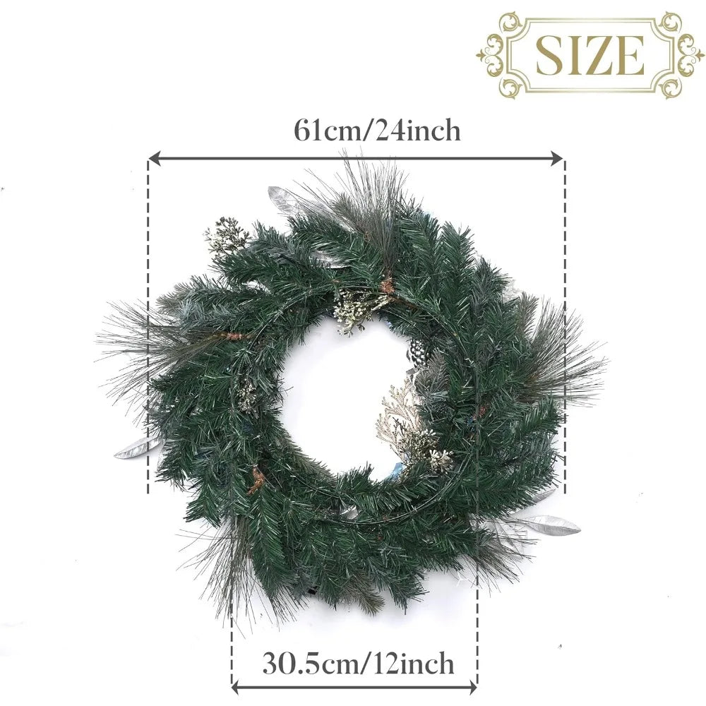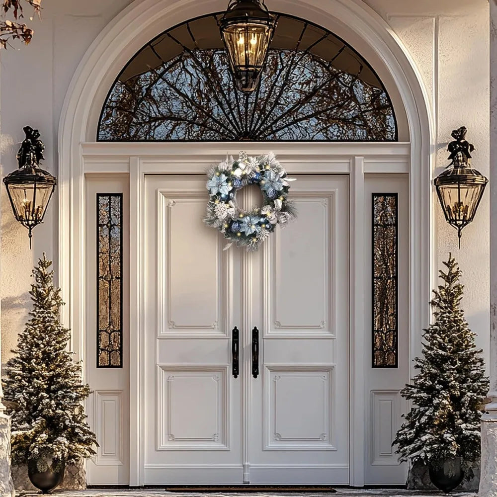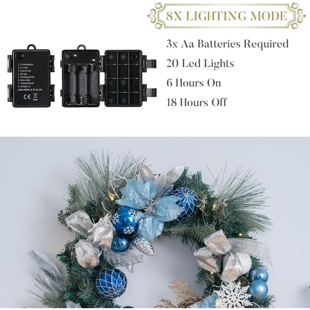 This 24-inch illuminated Christmas wreath brings festive elegance to your front door with its lush crestwood fir base, adorned with ornaments, ribbons, poinsettias, and snowflakes. The silvery blue lights feature an automatic timer—6 hours on, 18 hours off—so your wreath glows at the same time daily without manual adjustment. Perfect for doors, windows, fireplaces, or mantels, it works beautifully indoors or out. Display it alone or pair with garlands and other holiday décor to create a cohesive seasonal look that welcomes guests with warmth and charm.