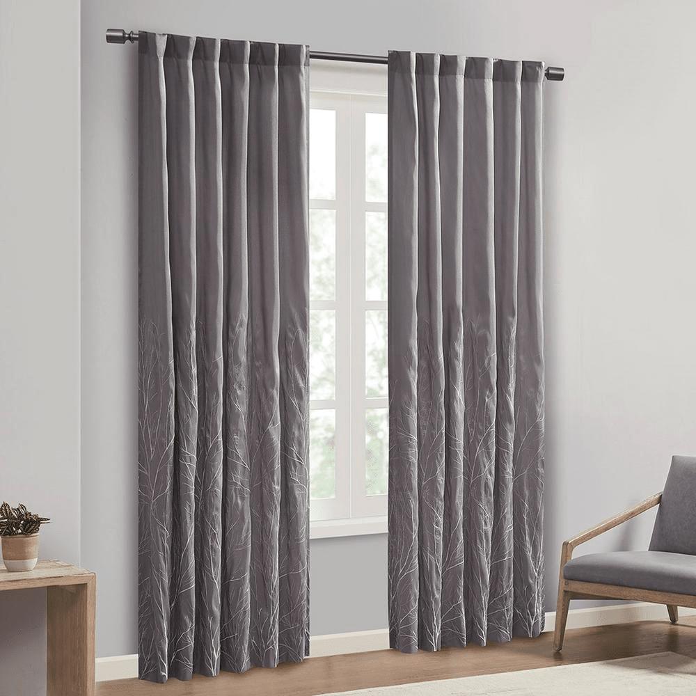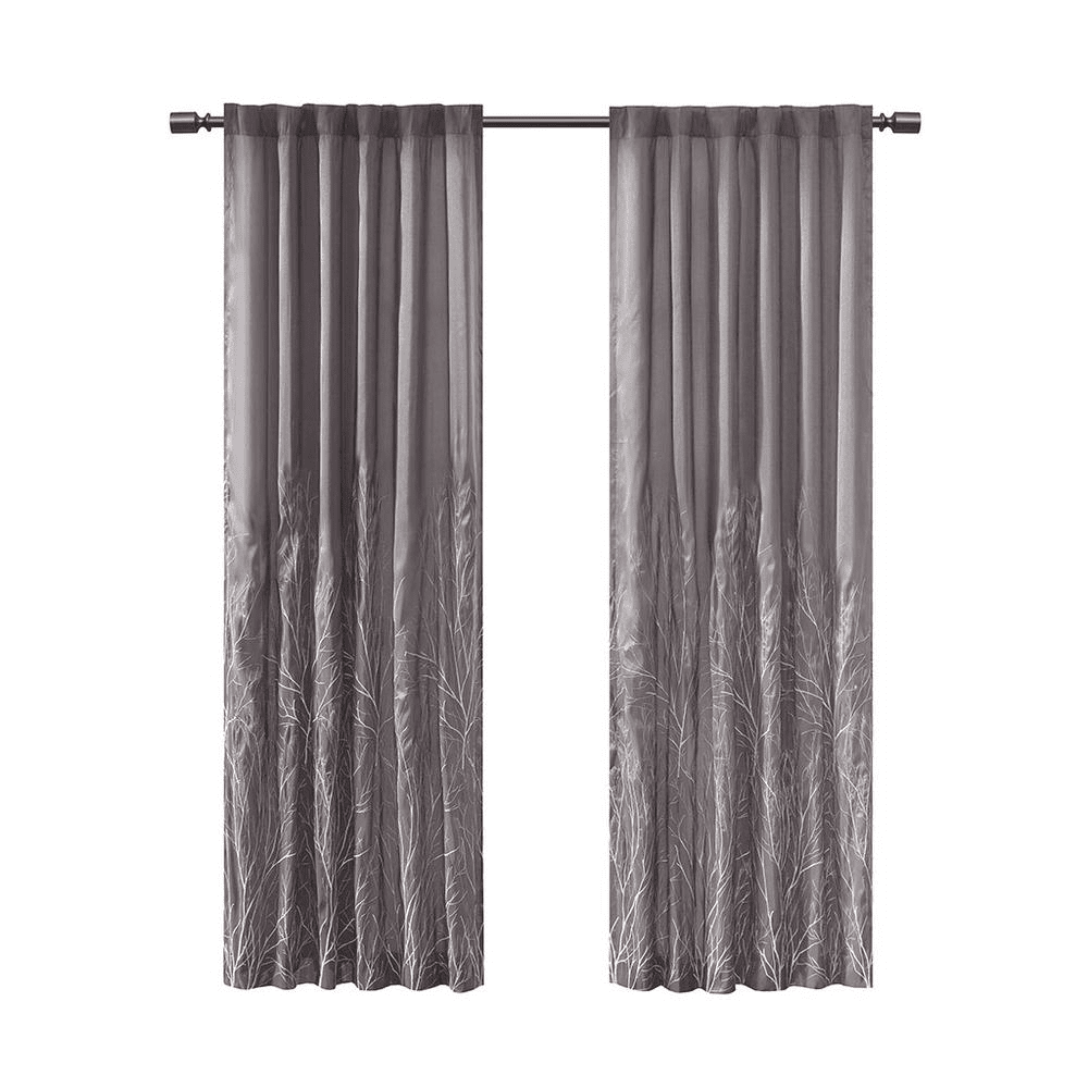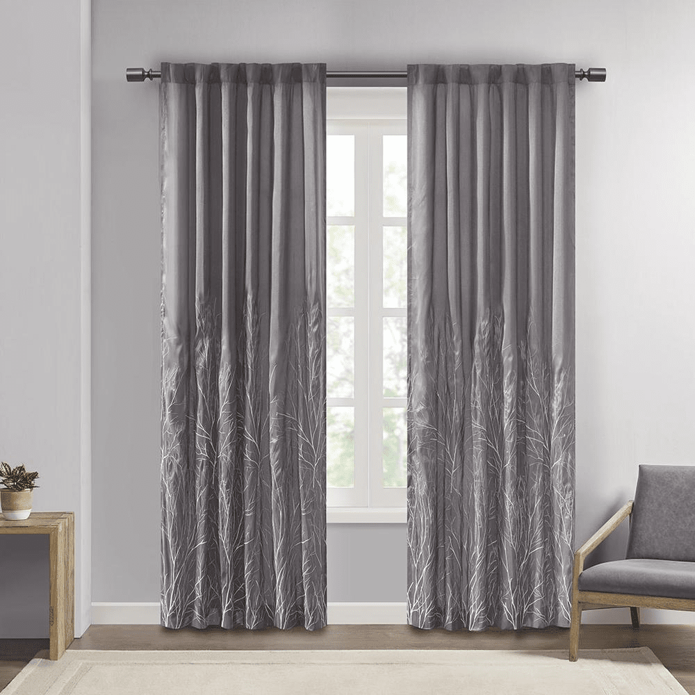 Experience style and nature in perfect harmony with the Madison Park Andora Window Panel. The exquisite embroidered tree branch design on luxurious faux silk adds a captivating contrast and dimension to any room. With additional lining for privacy and enhanced drapability, as well as a touch of sophistication from its shimmering sheen, this panel is the perfect addition to your decor. Use the rod pocket top for a laid-back look or the back tabs for a tailored finish. Accommodates up to a 1.25" diameter rod. Please note: slight texture and crinkles may remain after steaming (steam only, no ironing). Made in China from 100% polyester. Individual panels, not set.