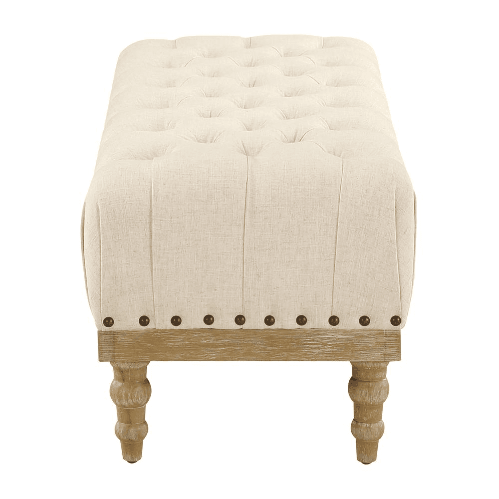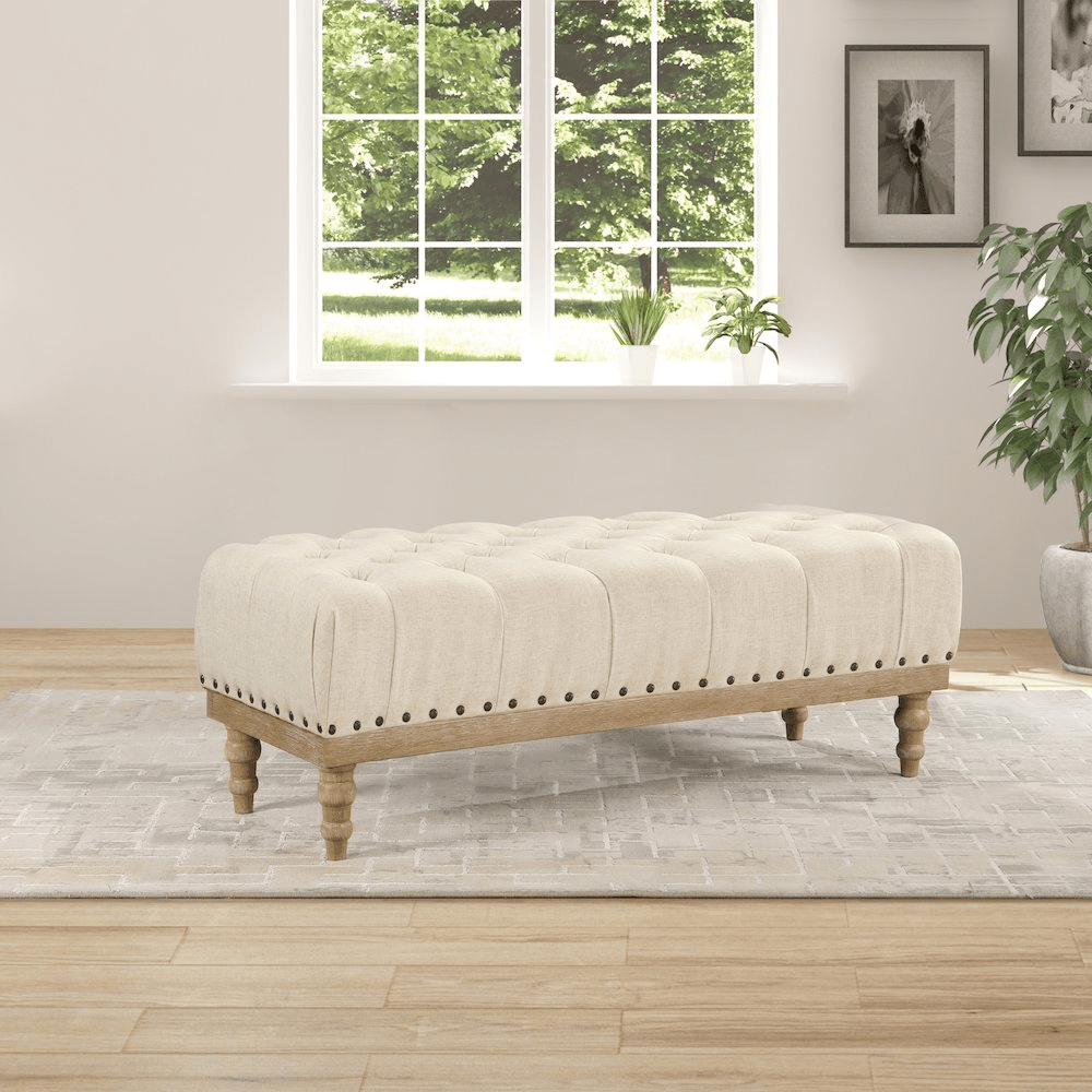 Welcome guests with elegance using the indoor ottoman Bench, featuring a button-tufted seat and classic turned legs. Perfect for framing your dining table or enhancing your guest room, this bench combines style with function. Its nailhead trim and dark-finished solid wood legs add sophistication while providing extra seating. Easy to assemble with simple leg attachment, it’s the ideal finishing touch in classic cottage style for your home.