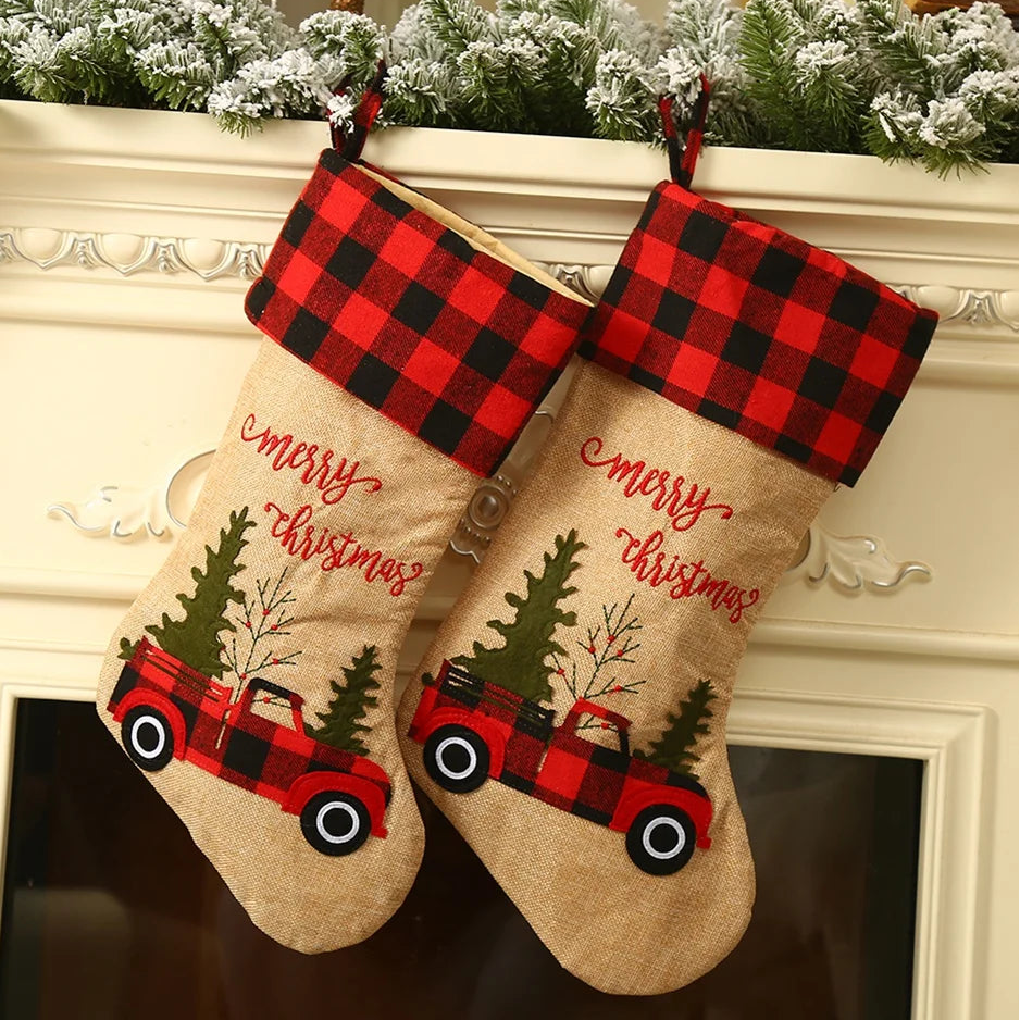 Bring festive charm to your home with these classic red and black plaid Christmas stockings. Perfect for holiday décor, these printed linen candy gift bags combine traditional plaid patterns with practical functionality. Ideal for displaying above the fireplace, hanging on doorways, or filling with small gifts and treats, they add warmth and character to any seasonal display. Available in sets of one or two, these durable stockings capture the timeless appeal of holiday traditions while serving as both decoration and gift-giving solution. Make your Christmas setup complete with this essential holiday accessory.